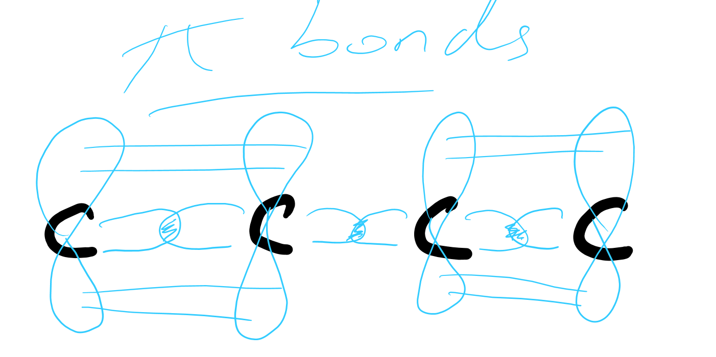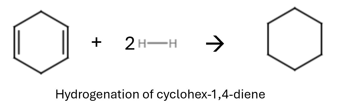 In reality the hydrogenation of hex-1,4-diene is -240kj/mol which is which we may have expected know the previous data, the hydrogenation od hex-1,3-diene is -232kj/mol which is more than expected. This difference in energy indicates that the hex-1,3-diene is more stable than the hex-1,4-diene and this is due to the electrons being delocalised between the alternating single and double bonds.