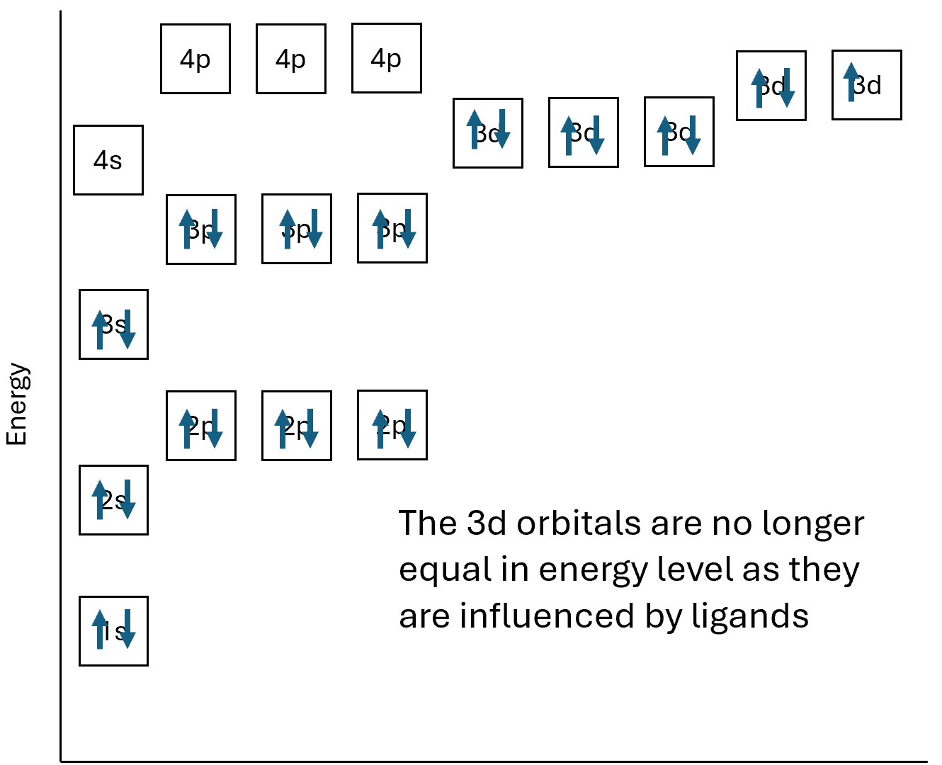 The d subshells all have the same energy level as each other, if an electron was to move between the d orbitals there would be no change in energy. When in a complex ion the electrons from the coordinate bond will affect the energy levels of the d subshell and the electron structure diagram would be different.